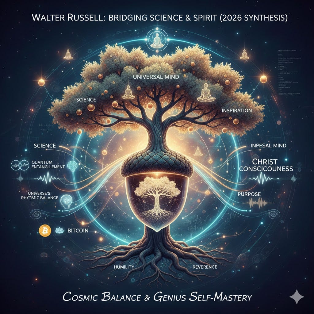 In the annals of human potential, few thinkers have bridged the chasm between science and spirit as elegantly as Walter Russell (1871–1963). A polymath whose insights spanned cosmology, physics, art, and philosophy, Russell experienced a profound cosmic illumination at age 14, emerging from a near-death encounter with diphtheria to proclaim humanity’s innate divinity. Over the course of 2025, my reflections on Russell’s teachings, shared through daily meditations on X have served as a digital acorn—small seeds of wisdom planted in the fertile soil of collective consciousness. This article synthesizes those insights, reframing Russell’s eternal principles in the language of today: an era where quantum entanglement meets mindfulness apps, and bitcoin’s decentralized energy mirrors the universe’s rhythmic balance.