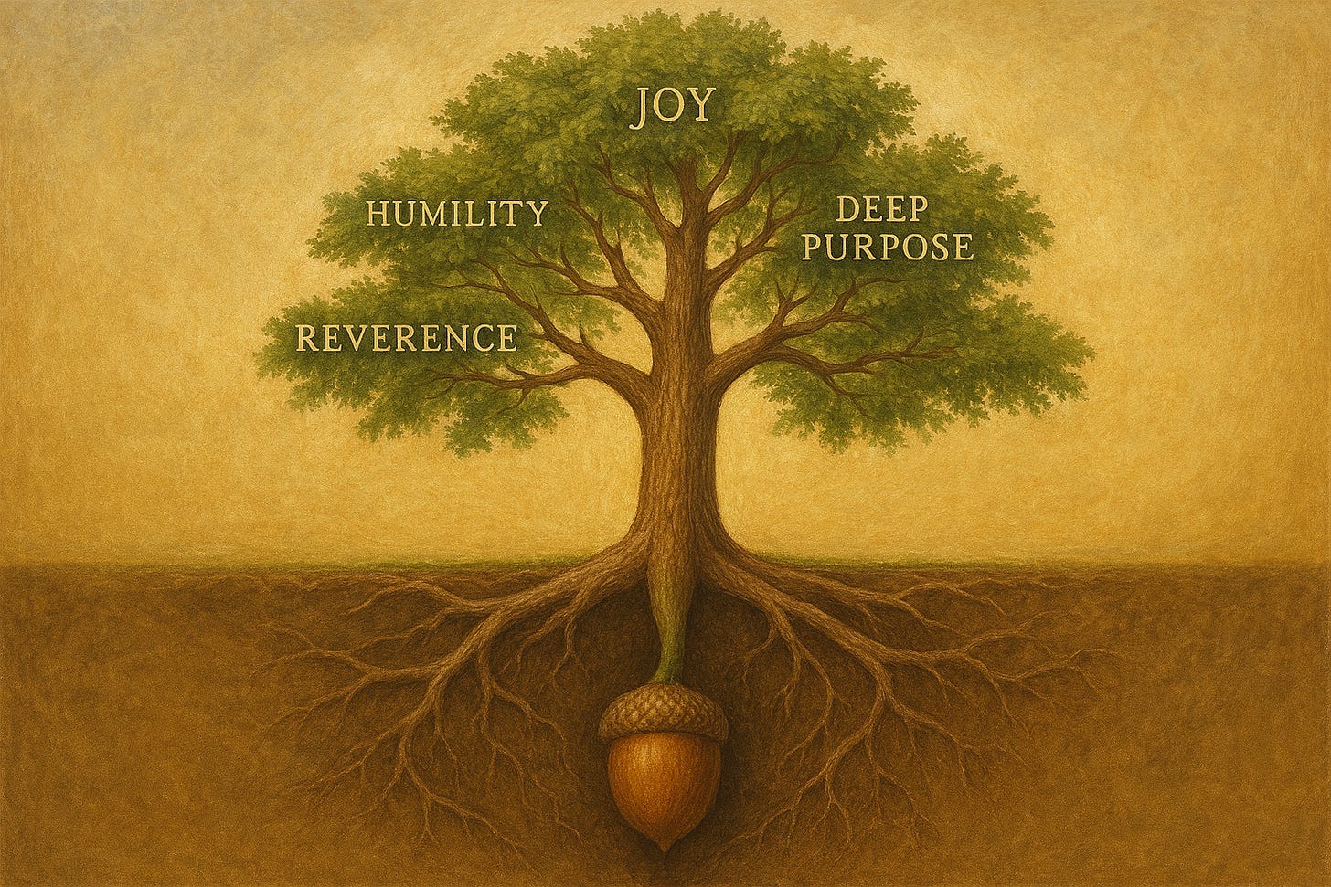 As the acorn germinates, roots delve deep into self-mastery, drawing nourishment from Russell’s Five Laws of Success: Humility, Reverence, Inspiration, Deep Purpose, and Joy. These are not abstract virtues but practical protocols for awakening genius—the self-bestowed gift Russell contrasted with self-inflicted mediocrity. In a December 2025 meditation, I shared: “Mediocrity is self-inflicted. Genius is self-bestowed.” This resonates with neuroplasticity research; the brain rewires through focused intent, transforming thought into neural architecture.