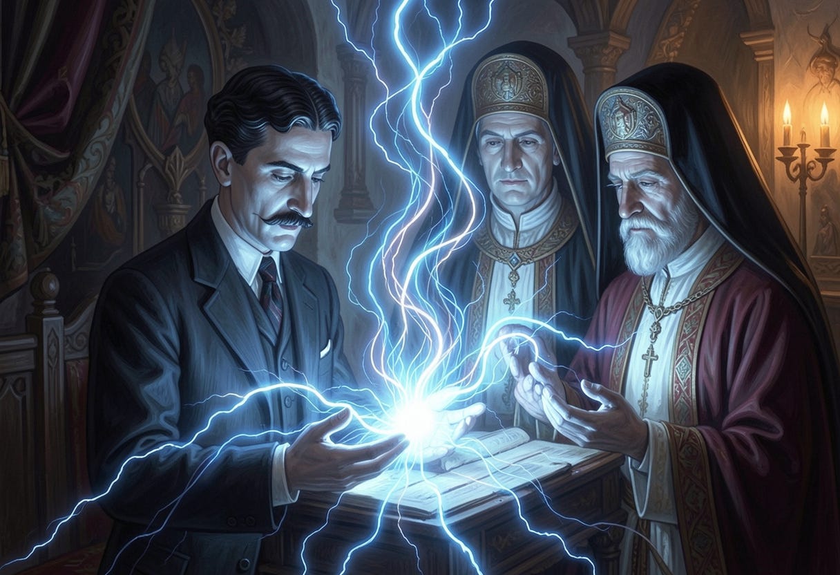 Nikola Tesla’s mother and father steeped him in the living mystical current of their Orthodox lineage. He emerged speaking of electricity as the pulse of conscious Light itself, drawing straight from Vedic Akasha and Prana. His vision was never just engineering; it was liberation technology — free energy for every sovereign family.