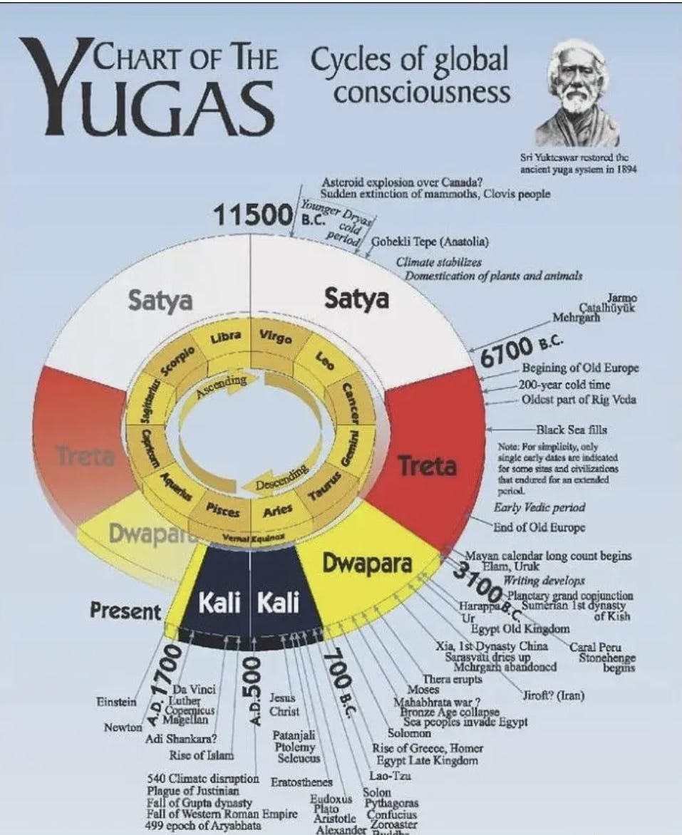 Sri Yukteswar told us we entered the ascending Dwapara Yuga in 1700. The Age of Aquarius is pouring knowledge from above. Electricity, information, and inner light are waking up together.