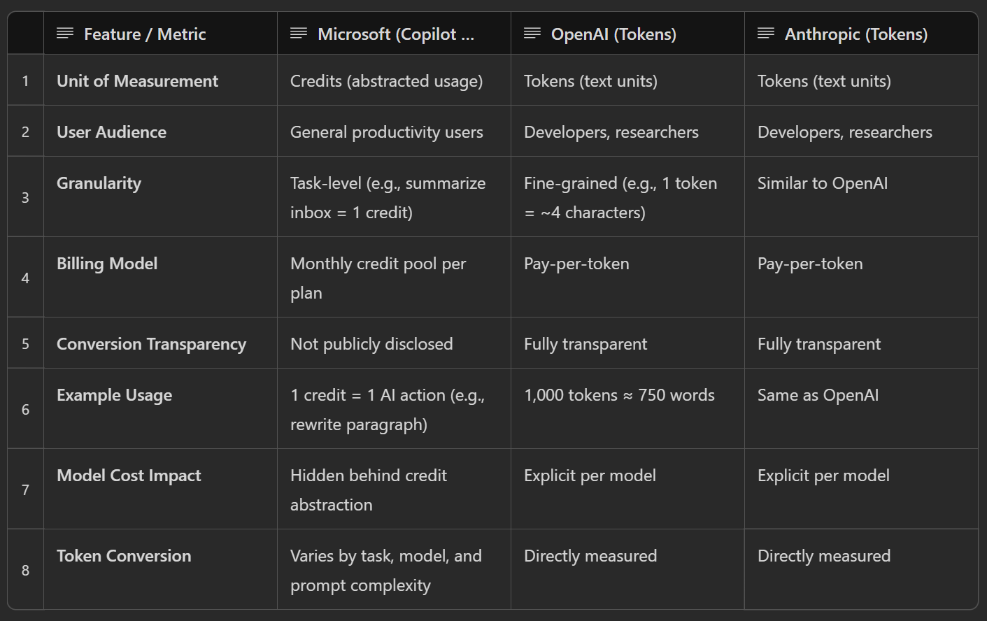 Cost Abstraction: Behind the scenes, Microsoft still calculates costs based on tokens and compute time. But presenting it as “credits” helps abstract the complexity for end users.