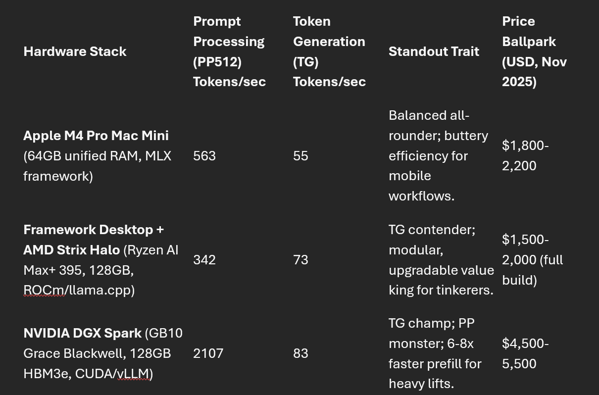 Broader takeaway: Bandwidth is king for PP. DGX’s 273GB/s HBM3e edges out Apple’s 546GB/s unified (wait, what? Apple’s higher, but NVIDIA’s architecture crushes in parallel KV cache handling). Strix Halo’s 256GB/s theoretical? Solid, but real-world ~212GB/s shows the gap. And with TG in the mix, Spark pulls ahead across the board.